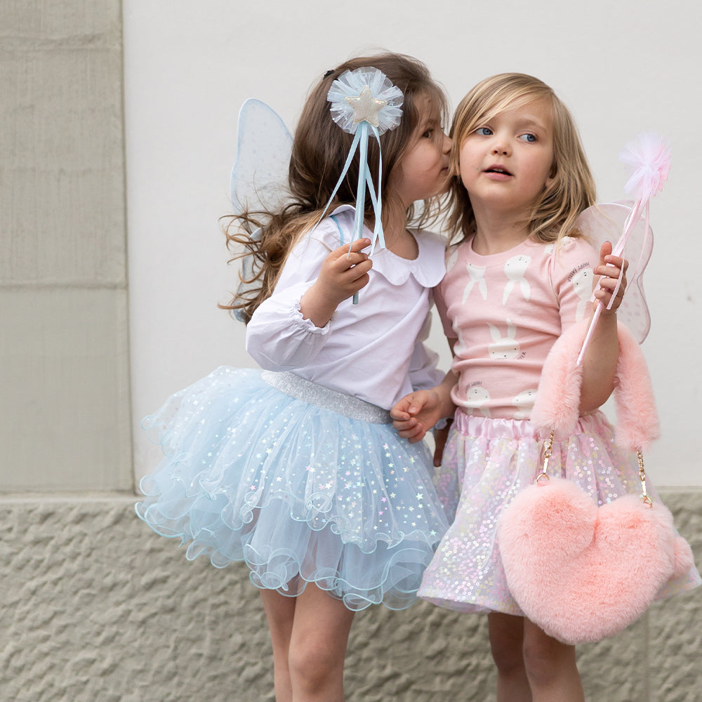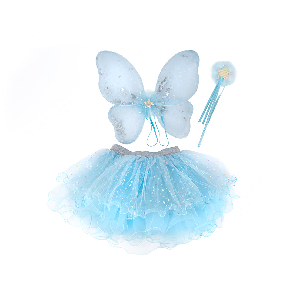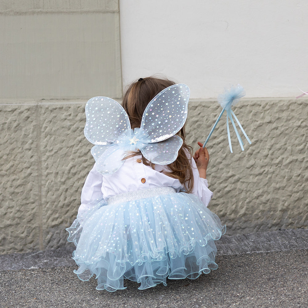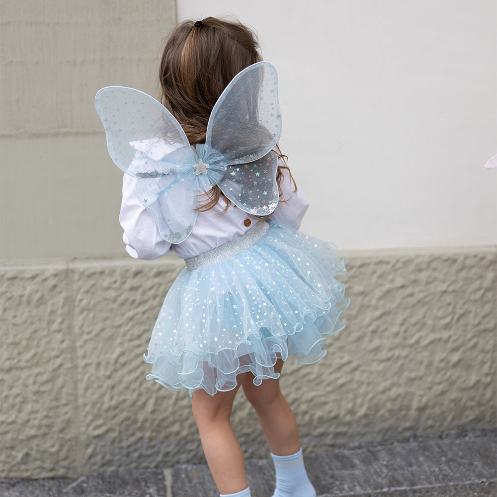 Πασπαλίστε λίγη αστεροσκόνη σε κάθε σας βήμα με αυτό το νεραϊδοσέτ της εταιρείας Great Pretenders. Αυτό το μαγευτικό σετ μεταμφίεσης περιλαμβάνει μια υπέροχη, γαλάζια τούλινη φούστα (tutu) με στρώσεις διακοσμημένες με λαμπερά ασημένια αστεράκια, ιδανική για στροβιλίσματα και φανταστικές περιπέτειες. Τα ασορτί φτερά νεράιδας κλέβουν τις εντυπώσεις – σε γαλάζιο χρώμα, γεμάτα με αιωρούμενα ασημένια αστέρια που λαμπυρίζουν και αλλάζουν καθώς κινείστε, δημιουργώντας μια μαγευτική, ουράνια λάμψη που ζωντανεύει κάθε παραμυθένιο όνειρο. Το look ολοκληρώνεται με το ασορτί ραβδάκι, διακοσμημένο με ένα μεγάλο, λαμπερό αστέρι στο κέντρο και γαλάζιο τούλι γύρω του, που δίνει έξτρα παιχνιδιάρικη πινελιά. Είτε ρίχνετε ξόρκια, είτε χορεύετε στον κήπο, είτε απλώς αφήνετε τη φαντασία σας ελεύθερη, αυτό το σετ είναι ο τέλειος συνδυασμός μαγείας και φαντασίας.