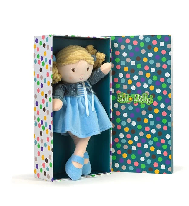 H Jacqueline θα γίνει η καινούρια φίλη του παιδιού σας! Από την ιταλική εταιρία Plush & Company .Είναι μιά κομψή και χαριτωμένη πάνινη κούκλα. Φοράει τζίν μπουφάν με σιέλ φόρεμα με ρίγες στο πάνω μέρος και ασορτί παπούτσια η εμφάνιση της ολοκληρώνεται με τα μαλλιά της που τα έχει κάνει 2 κοτσίδες και θέλει συνέχεια αγκαλιές και φροντίδα!