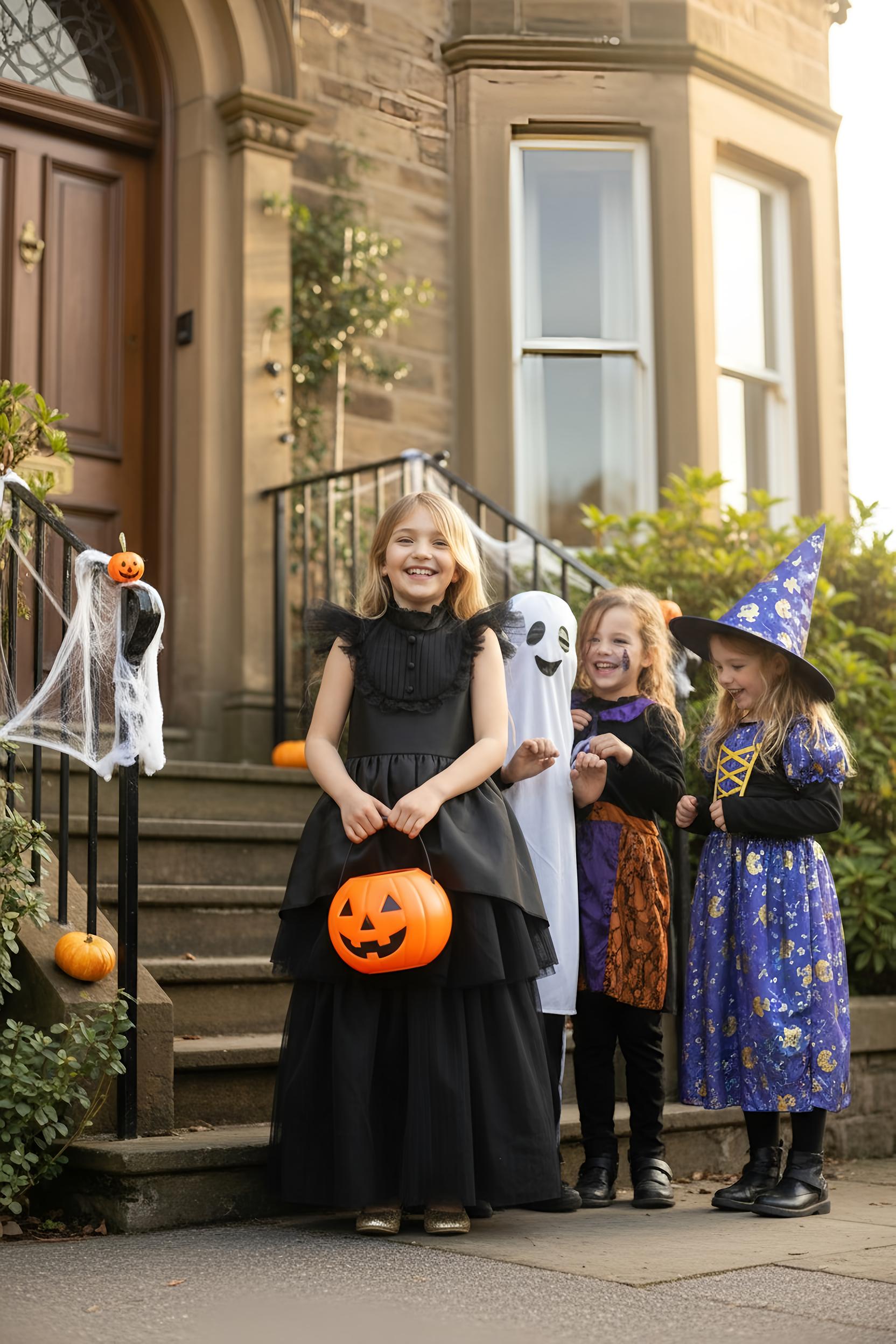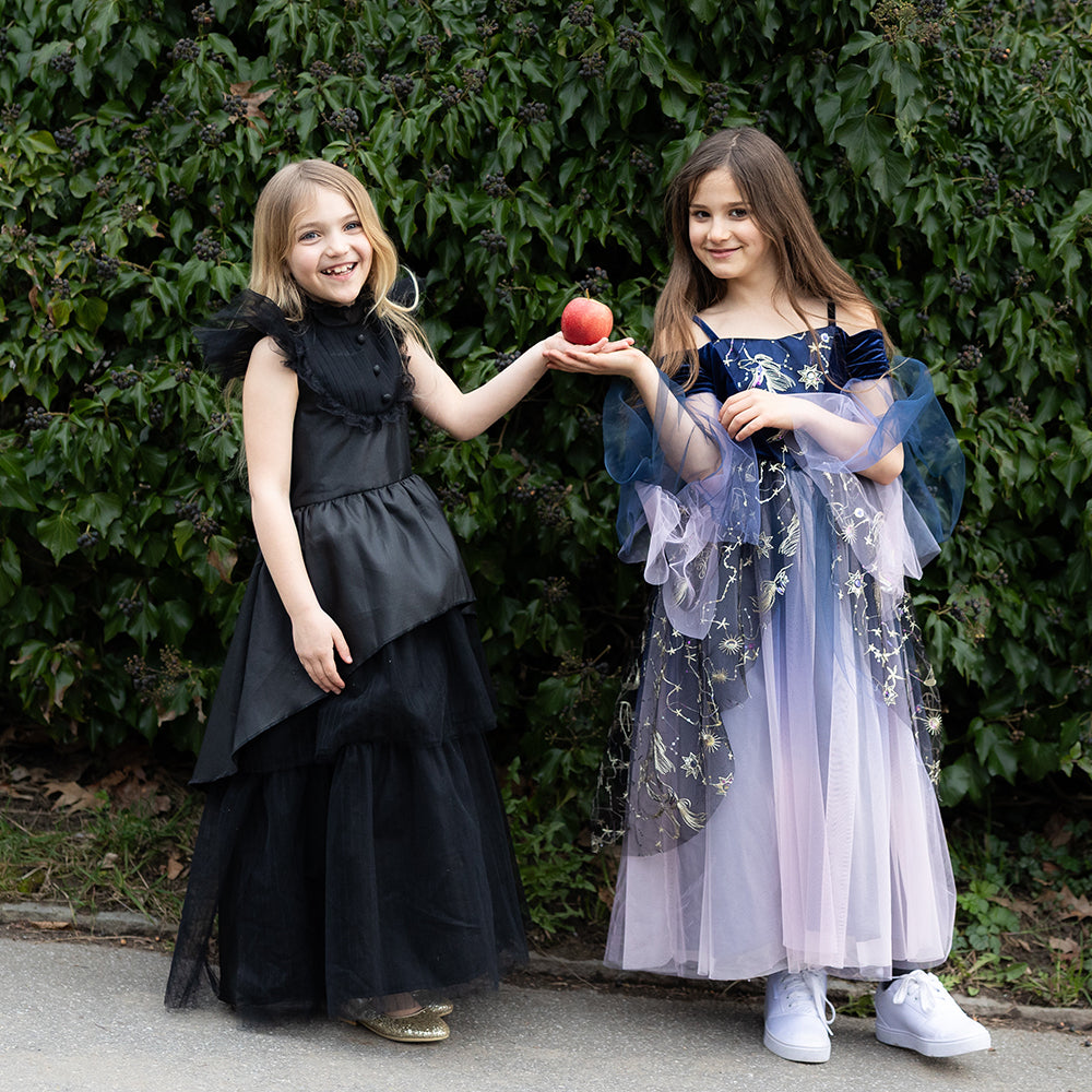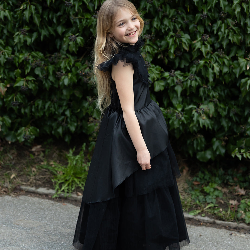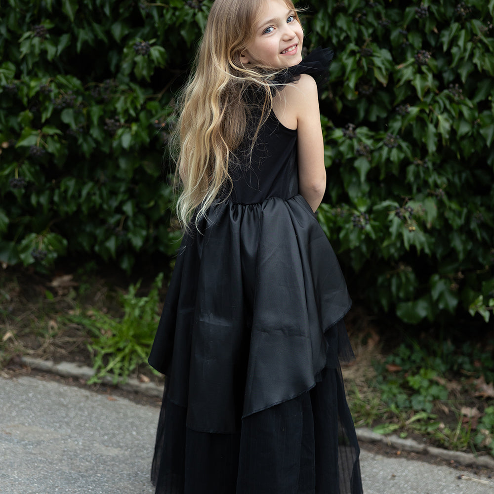 Αναδείξτε το μυστηριώδες στιλ της μικρής σας με αυτό το εντυπωσιακό φόρεμα της Great Pretenders. Σε μαύρη απόχρωση, συνδυάζει στοιχεία θεατρικότητας και κομψότητας, ιδανικό για μικρές μάγισσες που θέλουν να ξεχωρίζουν. Το επάνω μέρος του διαθέτει διακοσμητικά κουμπιά και ιδιαίτερες λεπτομέρειες από τούλι στους ώμους, προσθέτοντας δραματικό ύφος και γοητεία. Η φούστα εντυπωσιάζει με το ασύμμετρο κόψιμο και τα πολυεπίπεδα στρώματα τούλι, δημιουργώντας πλούσιο όγκο και αέρινη κίνηση σε κάθε βήμα. Ιδανικό για αποκριάτικες εμφανίσεις, Halloween parties, θεατρικές παραστάσεις ή για παιχνίδι ρόλων.