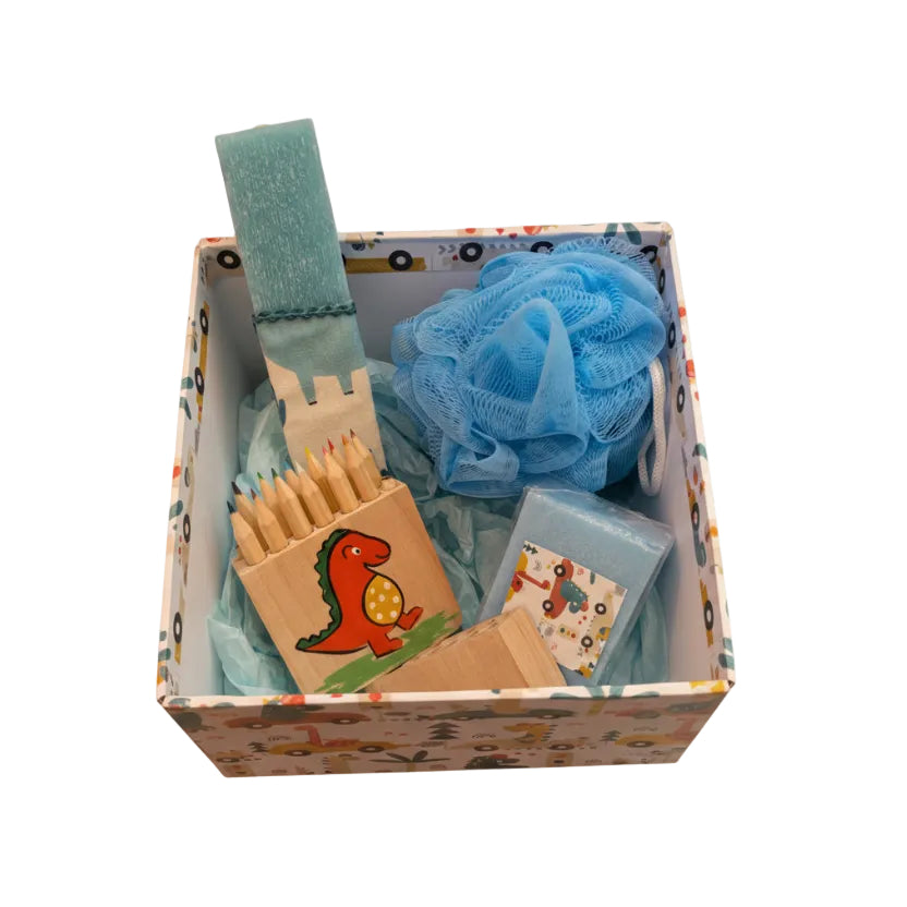 - ενα ξύλινο κουτί ξυλομπογιές σε ασορτί σχέδιο για τις πρώτες του ζωγραφιές.