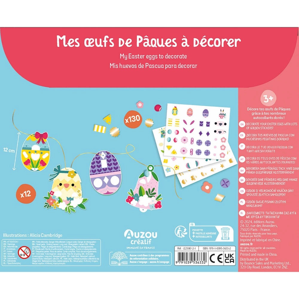 Διακοσμήστε τα 12 ιδιαίτερα αυγά με τα αυτοκόλλητα που περιλαμβάνονται στη συσκευασία για να δημιουργήσετε τα πιο όμορφα και πολύχρωμα πασχαλινά στολίδια. Όταν ολοκληρώσετε τα αυγά σας, περάστε τη χρυσή κλωστή που σας δίνεται μέσα από τις τρύπες, για να φτιάξετε μια υπέροχη γιρλάντα!