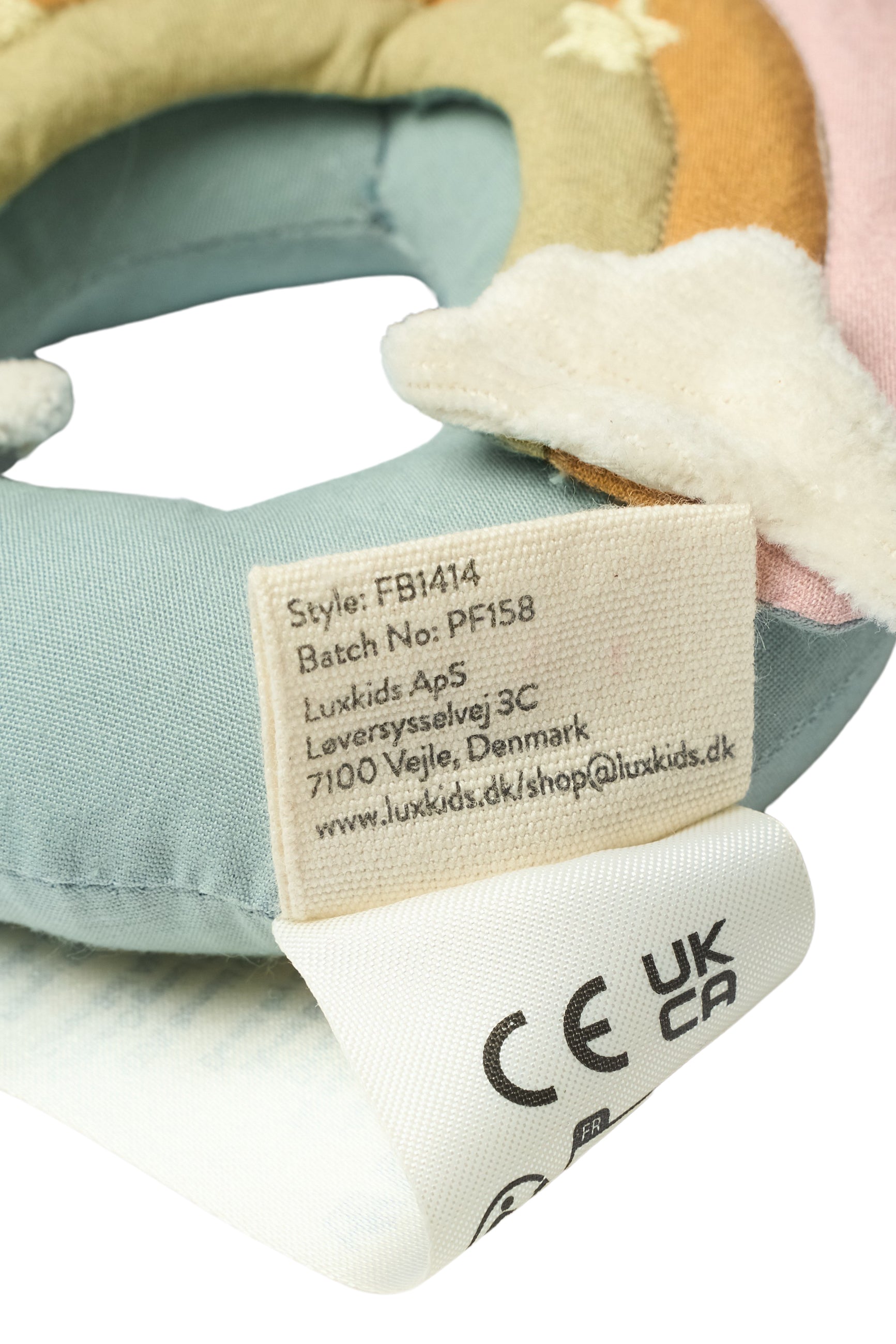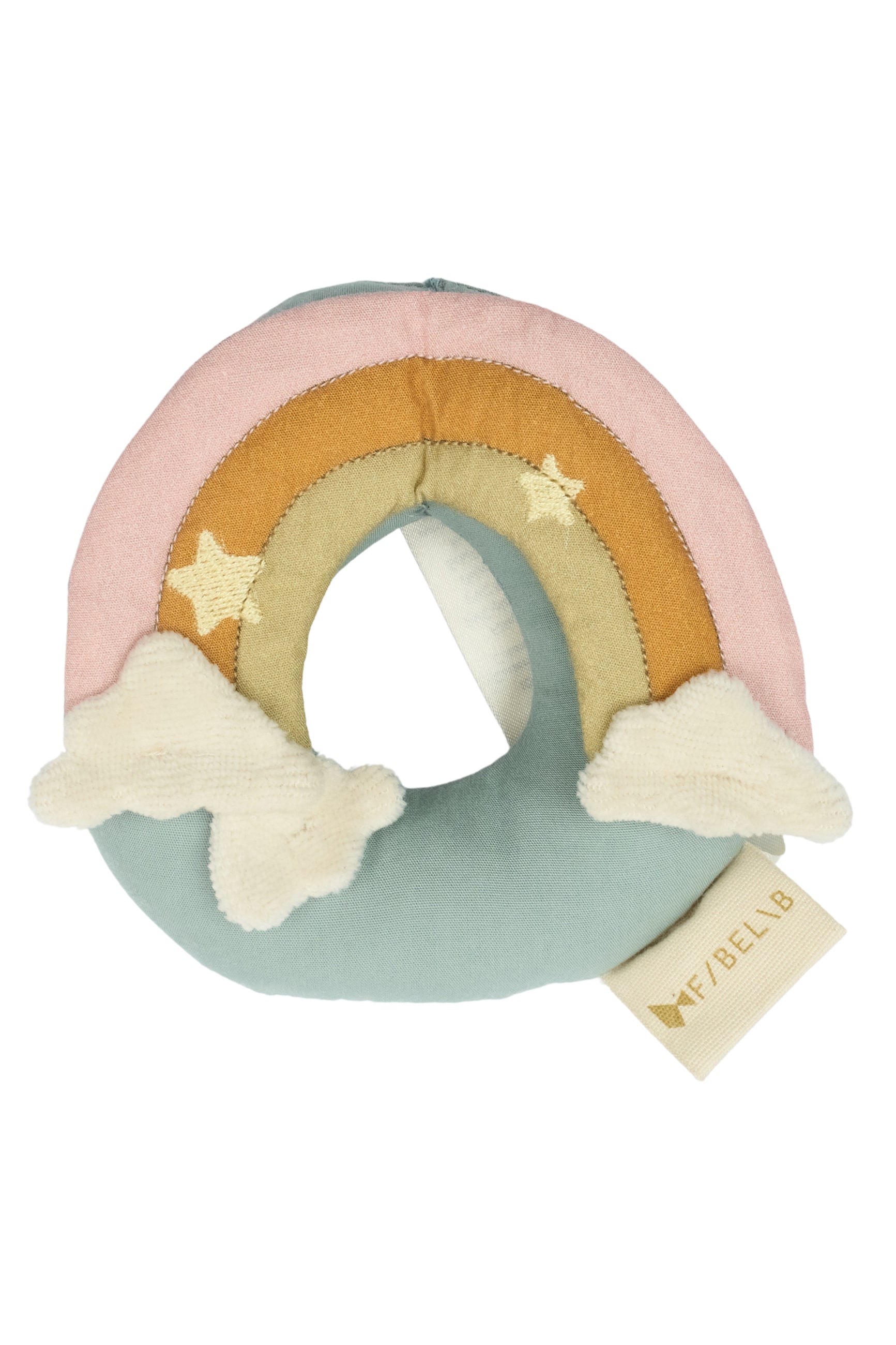 Κουδουνίστρα – Ουράνιο Τόξο είναι εύκολο να το κρατήσουν και να το πιάσουν τα μικρά χεράκια. Το υφαντό βαμβακερό ύφασμα προσφέρει μια απαλή, απτή επιφάνεια, ενθαρρύνοντας το μωρό σας να εξερευνήσει διαφορετικές αισθήσεις καθώς πιάνει και κουνάει την κουδουνίστρα.