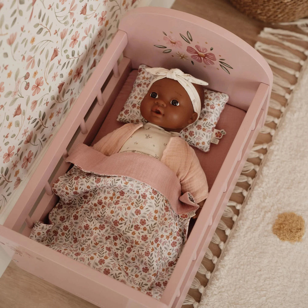 Σε αυτό το ξύλινο κρεβάτι για κούκλες, η κούκλα σας κοιμάται υπέροχα απαλά και άνετα. Το κρεβάτι διαθέτει ένα άνετο μαξιλάρι, μια ζεστή κουβέρτα και ένα μαλακό στρώμα, όλα με το μαγευτικό σχέδιο Soft Flowers.