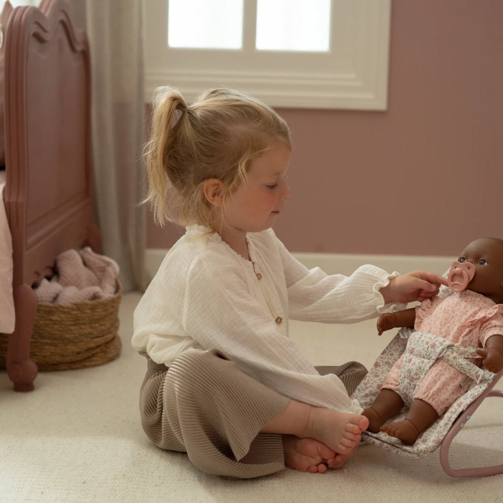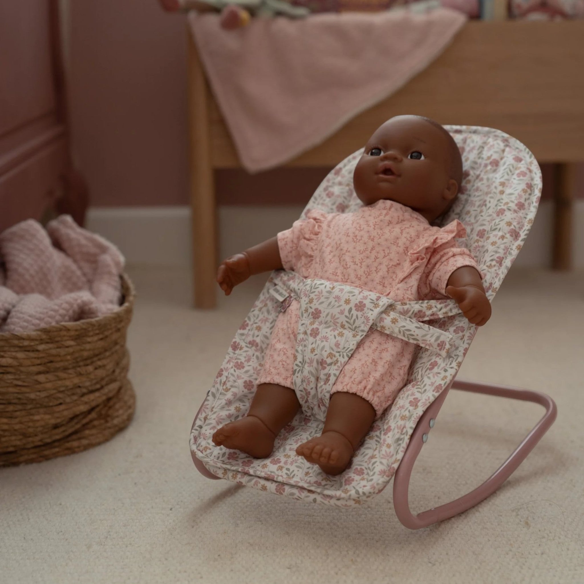 Το κάθισμα είναι διακοσμημένο με το χαριτωμένο σχέδιο Soft Flowers, προσθέτοντας στυλ. Ελαφρύ και εύκολο στη χρήση δίπλα σε οποιοδήποτε τραπέζι παιχνιδιού, είναι ιδανικό για μικρούς γονείς που θέλουν η κούκλα τους να συμμετέχει σε όλα.