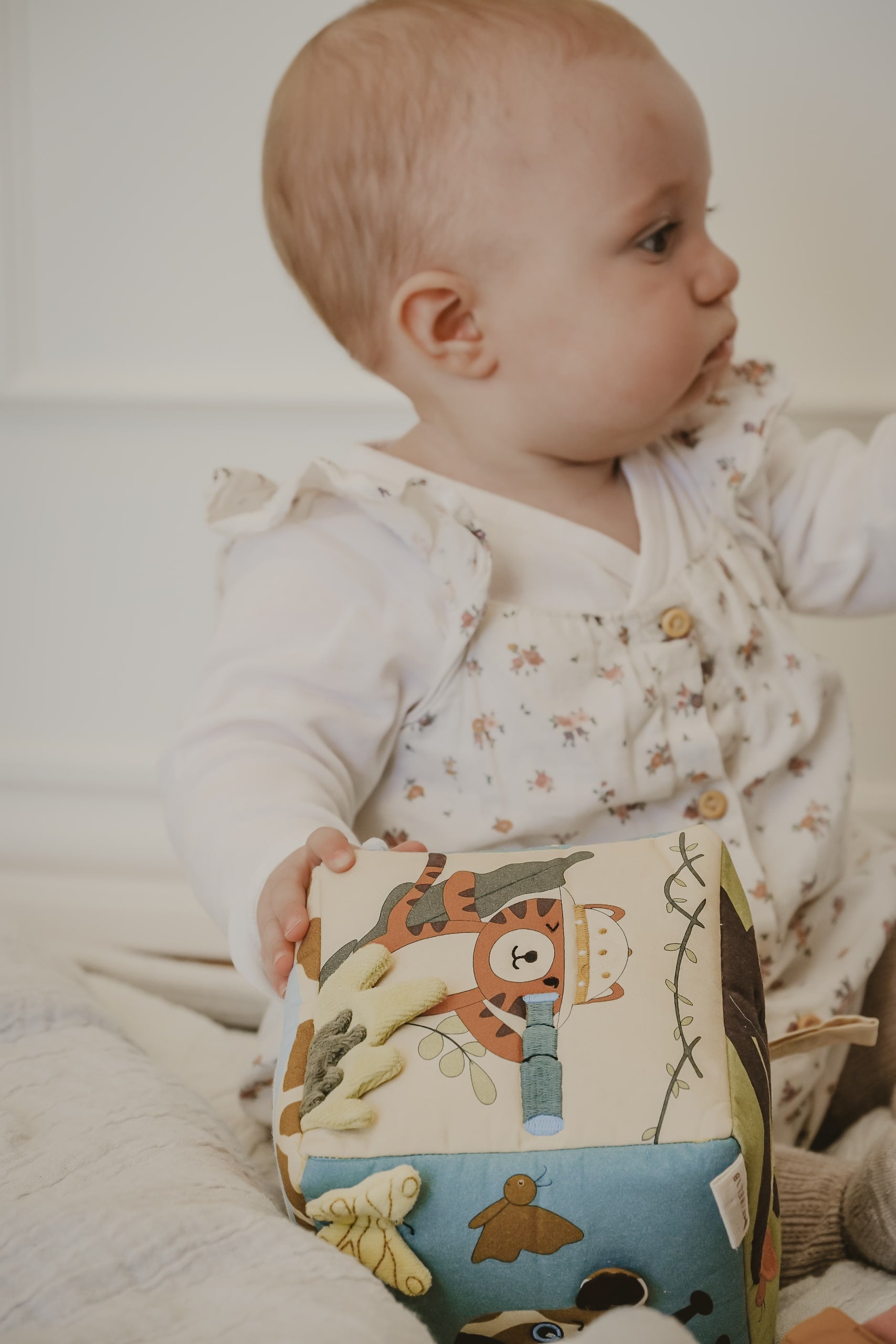 Κουνήστε, πιέστε και ανακαλύψτε! Ο Υφασμάτινος Κύβος – Safari είναι ένα απαλό παιχνίδι δραστηριοτήτων γεμάτο με αισθητηριακές εκπλήξεις. Το μωρό μπορεί να εξερευνήσει ανάγλυφες επιφάνειες, πτερύγια, ετικέτες και φιλικά ζώα σαφάρι – όλα σε γήινους, χαλαρωτικούς τόνους.