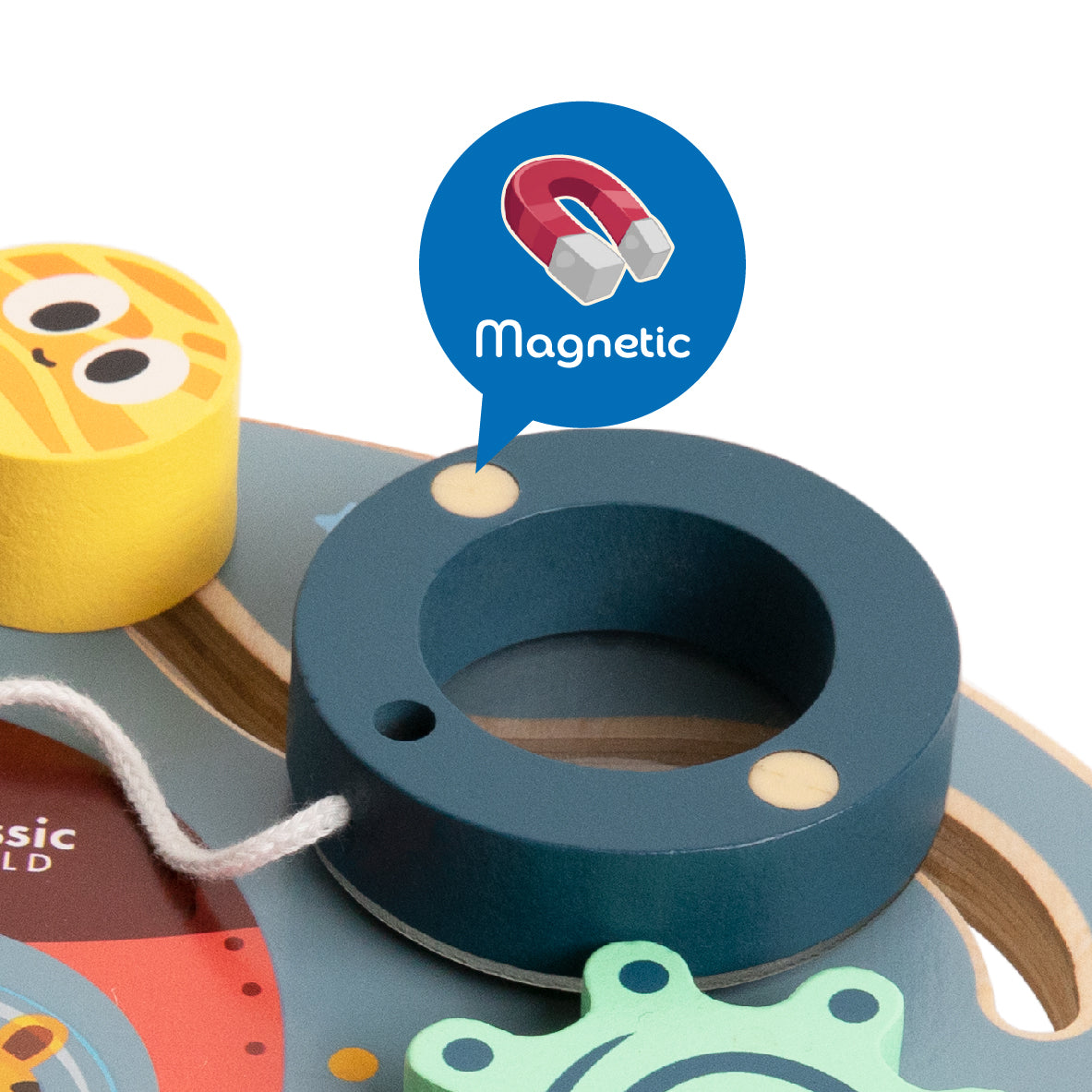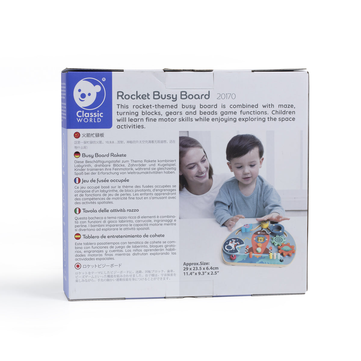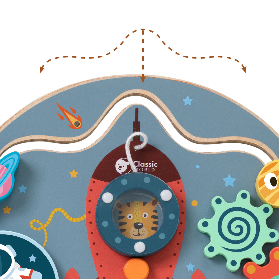 Αυτός ο ξύλινος πίνακας δραστηριοτήτων με θέμα έναν πύραυλο συνδυάζει λαβύρινθο, περιστρεφόμενα μπλοκ, γρανάζια και παιχνίδι με χάντρες. Μέσα από τις διάφορες διαστημικές δραστηριότηες, τα παιδιά απολαμβάνουν το παιχνίδι ενώ αναπτύσσουν τις λεπτές κινητικές τους δεξιότητες.