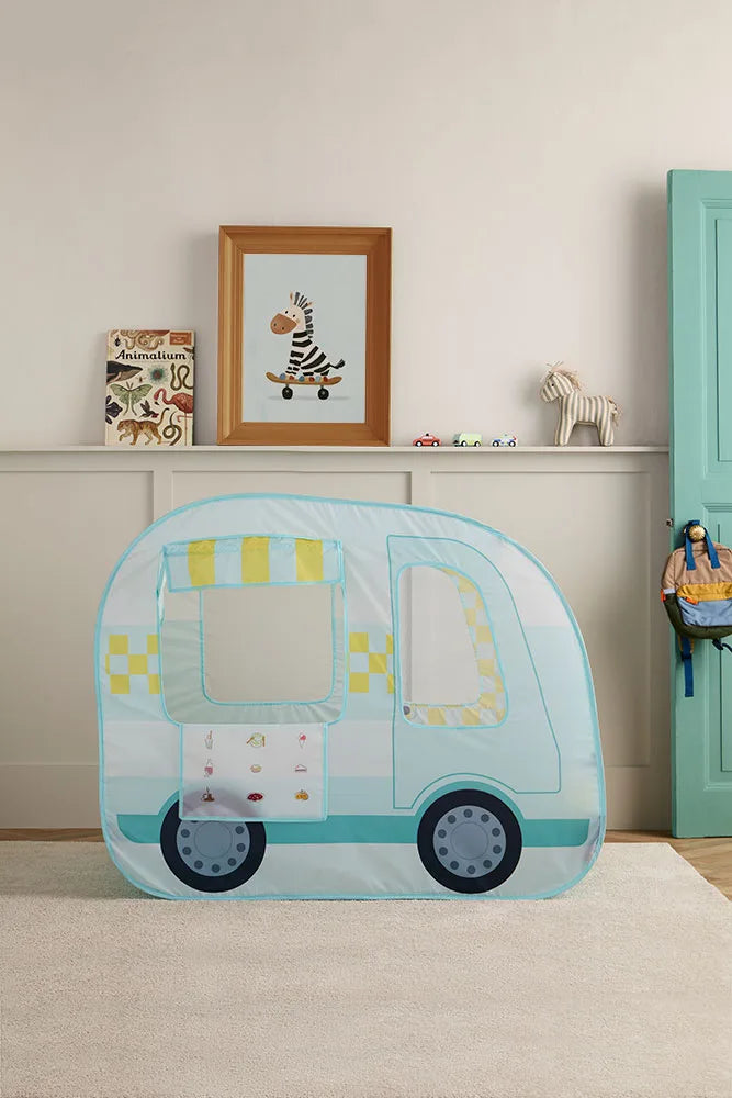 Αλλά δεν σταματάμε εκεί - όταν ξεδιπλωθεί, αυτή η πολυχρηστική σκηνή μεταμορφώνεται σε ένα απίθανο τροχόσπιτο κάμπινγκ. Με άνοιγμα στην οροφή, τα παιδιά μπορούν να απολαμβάνουν φρέσκο αέρα ενώ παριστάνουν ότι οδηγούν προς συναρπαστικούς προορισμούς με φίλους ή αδέλφια.