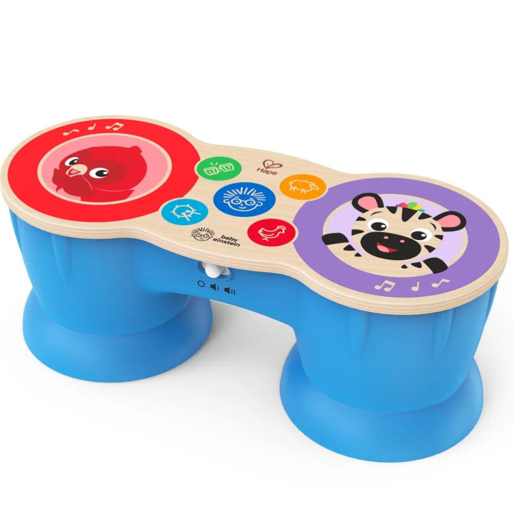 Hape Kids II Ξύλινο Magic Touch Drum Upbeat Tunes . Το Magic Touch Drums είναι ένα ξύλινο παιχνίδι που θα κάνει το μικρό σας να ασχοληθεί με την μουσική από μικρή ηλικία! Το παιχνίδι, από τη σειρά Baby Einstein, διαθέτει την τεχνολογία Magic Touch, η οποία συνδυάζει το φυσικό ξύλο με κουμπιά αφής. Οι 2 επιλογές οργάνων (τύμπανο και μπονγκό) και οι 2 ήχοι ζώων (κοτόπουλο και πρόβατο) ενθαρρύνουν το μωρό να ανακαλύψει νέους ήχους και μουσικές συνθέσεις. Αγγίξτε το μπλε κουμπί Baby Einstein για να ενεργοποιήσετε μία από τις 6 δημοφιλείς μελωδίες. Το παιχνίδι αναπτύσσει τις κινητικές δεξιότητες και σας επιτρέπει να ανακαλύψετε τη μαγεία της μουσικής. Διαθέτει κουμπί ρύθμισης της έντασης του ήχου.