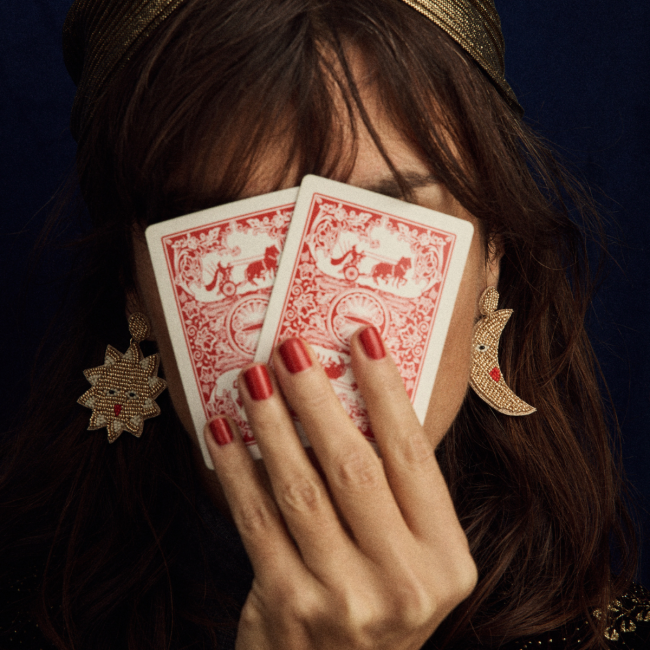 The delicate, luminous gold earrings capture the light and add a touch of subtle sparkle to the face. Their poetic design evokes complementary energies and the beauty of contrasts.