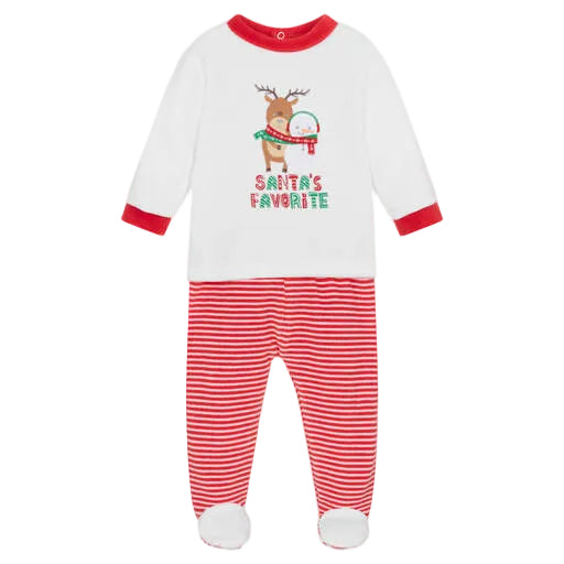 Red Cotton Velour Festive Trouser Set Adorable red trouser set for little boys and girls by FS Baby, made in soft cotton velour.The cosy and comfortable top has a lovely festive reindeer and snowman appliqué on the front. Popper fastenings on one shoulder help with quick and easy dressing. The matching red trousers have a gently elasticated waistband for a comfortable fit.