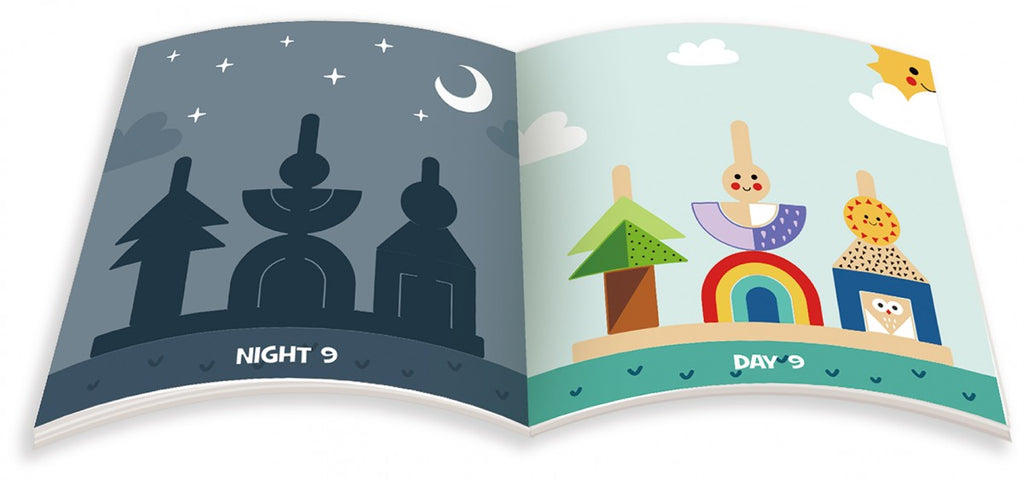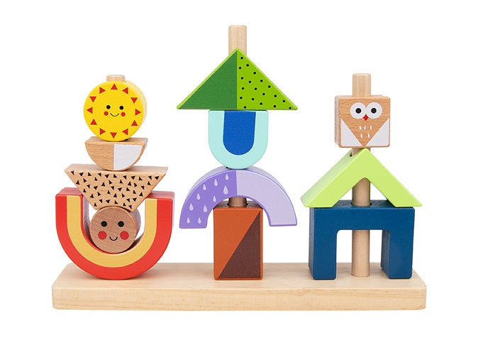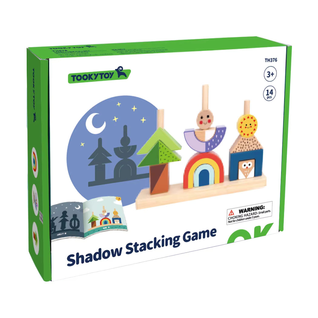 The wooden shadow stacking game is a creative and educational toy consisting of 12 colorful wooden pieces of different shapes and designs, a wooden base, and an illustrated instruction booklet.