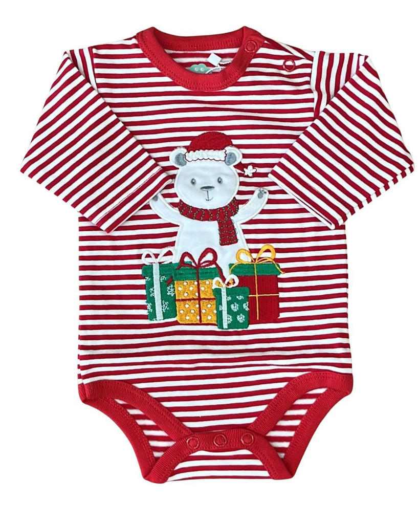 100% cotton Christmas striped bodysuit with embroidery on the front.