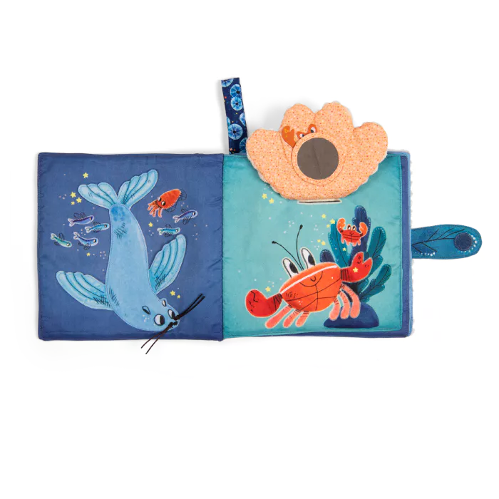 A fabric booklet with various materials and textures, dealing with hide-and-seek activities. Product dimensions 20x20 cm. Washable at 30°C on a wool wash cycle. Do not tumble dry. Fabric Made of cotton, plastic or polyester