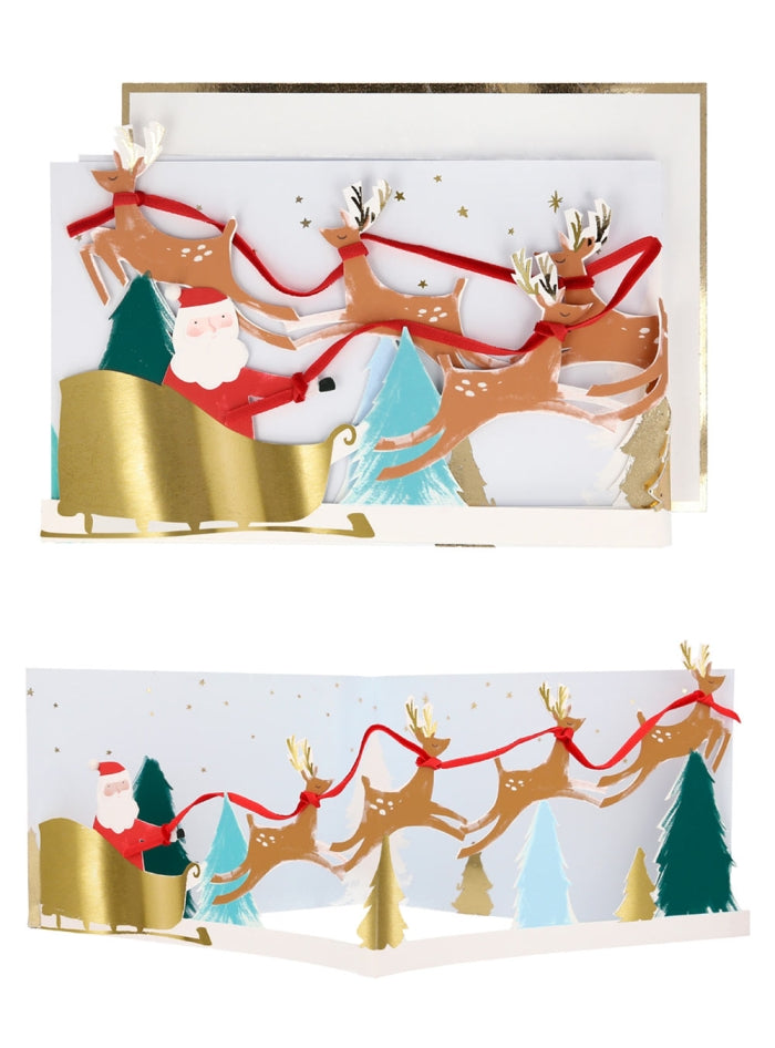 Paper Christmas greeting card with Santa's sleigh.
