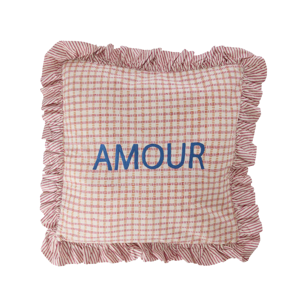 Beautiful pillow in cotton with a cute, checkered pattern, fun ruffles and an "amour" embroidery. For a touch of everyday magic place it on the terrace, or simply on the couch in the living room. A colorful pillow like this will create a wonderful vibe. Spot clean only.