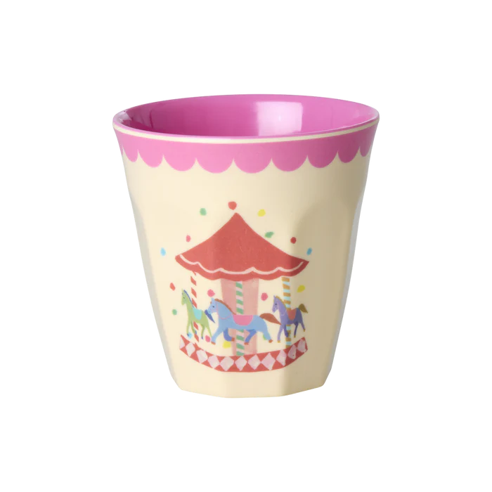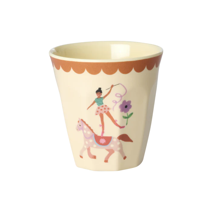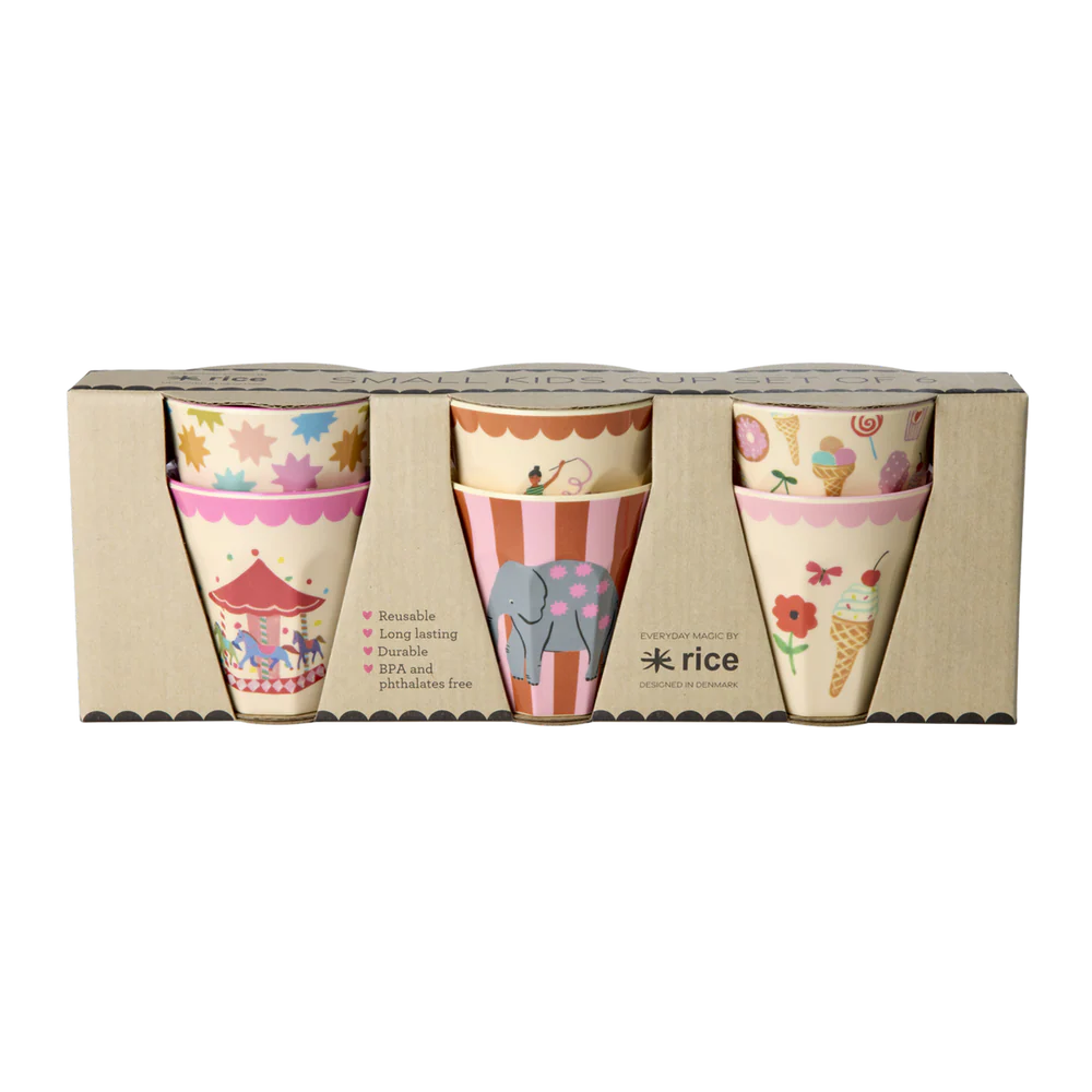 Let's go to the fair! This set of 6 small cups is filled with elegant circus performers, candy floss, ice cream cones and carousels. The cups are made of melamine, which is durable and ideal for everyday use due to its strength and easy cleaning. It does not absorb color or flavor from food - super practical for both children and adults!