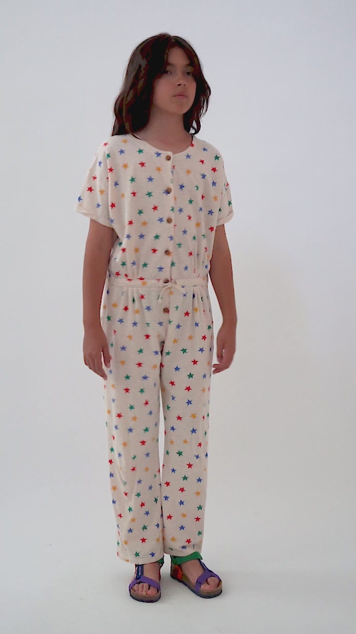 Ολόσωμη παιδική φόρμα από 100% οργανικό βαμβάκι σε μπεζ χρώμα με πολύχωμα αστεράκια. Με ξύλινα κουμπάκια μπροστά και κορδόνι που σφίγγει στη μέση.