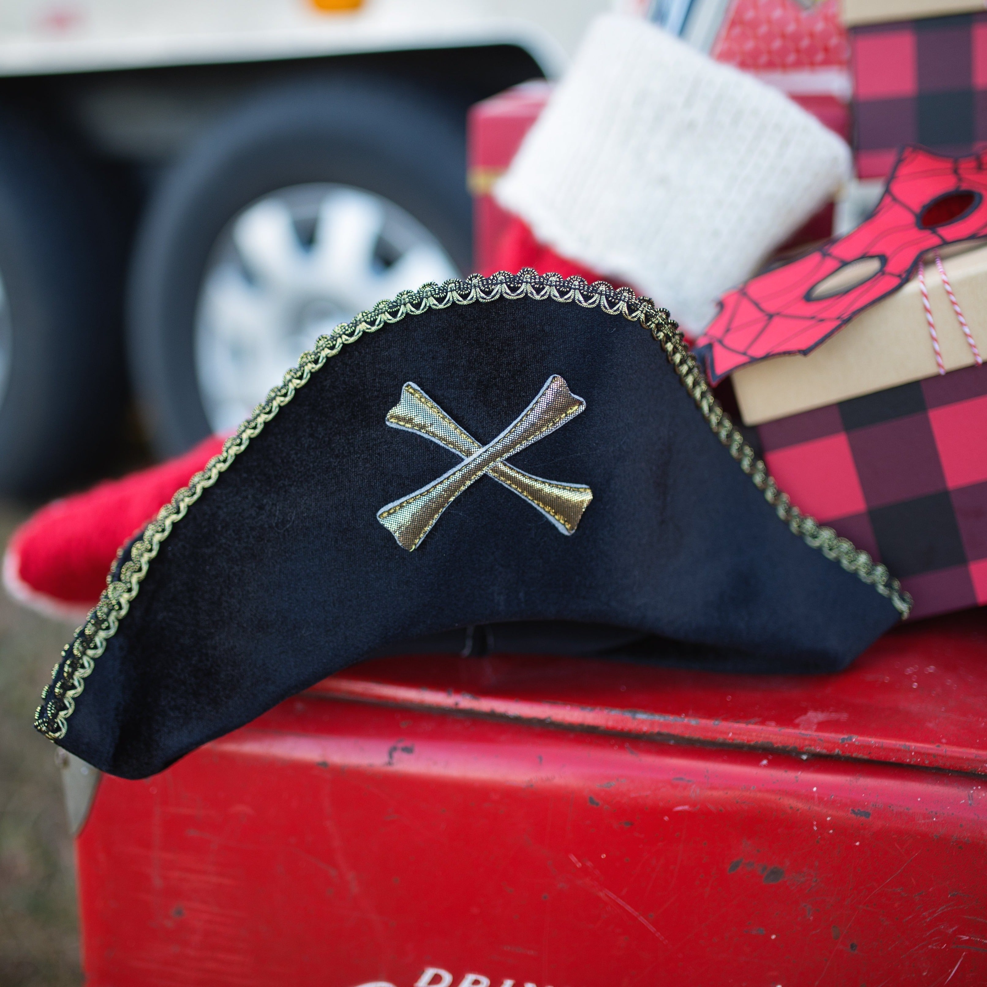 Κάθε καπετάνιος πλοίου θα μπορούσε να χρησιμοποιήσει ένα πειρατικό καπέλο, γιατί να μην το κάνει το καλύτερο πειρατικό καπέλο! Φτιαγμένο από απαλό μαύρο αφρώδες βελούδο, αυτό το καπέλο είναι κατασκευασμένο για να συμβαδίζει με τη γρήγορη ζωή του καπετάνιου ενός πλοίου. Διακοσμημένο σε μεταλλικό χρυσό διακοσμητικό και με ένα αστραφτερό έμβλημα εμπνευσμένο από πειρατές. Σημαδεμένο με τα θρυλικά σταυρωτά οστά - το σίγουρο σημάδι ενός πειρατή ηγέτη για εξαιρετικές περιπέτειες παιχνιδιού!