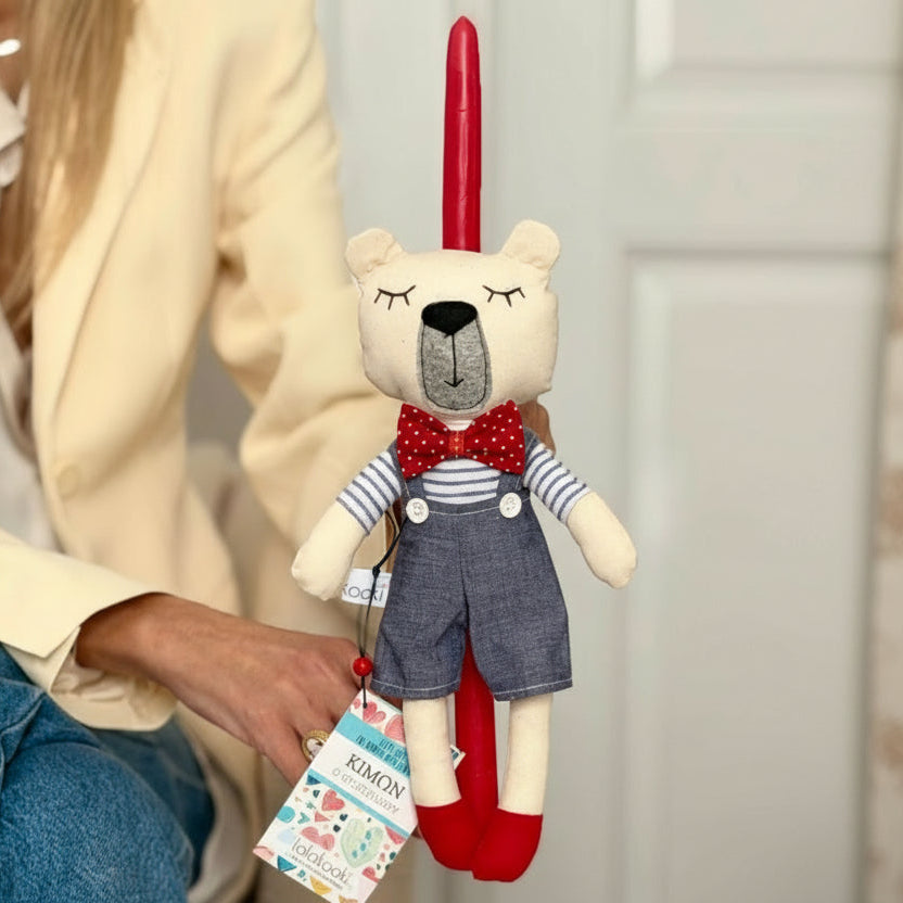 Πασχαλινή λαμπάδα με χειροποίητο υφασμάτινο αρκουδάκι, ραμμένο με βαμβακερά υφάσματα.